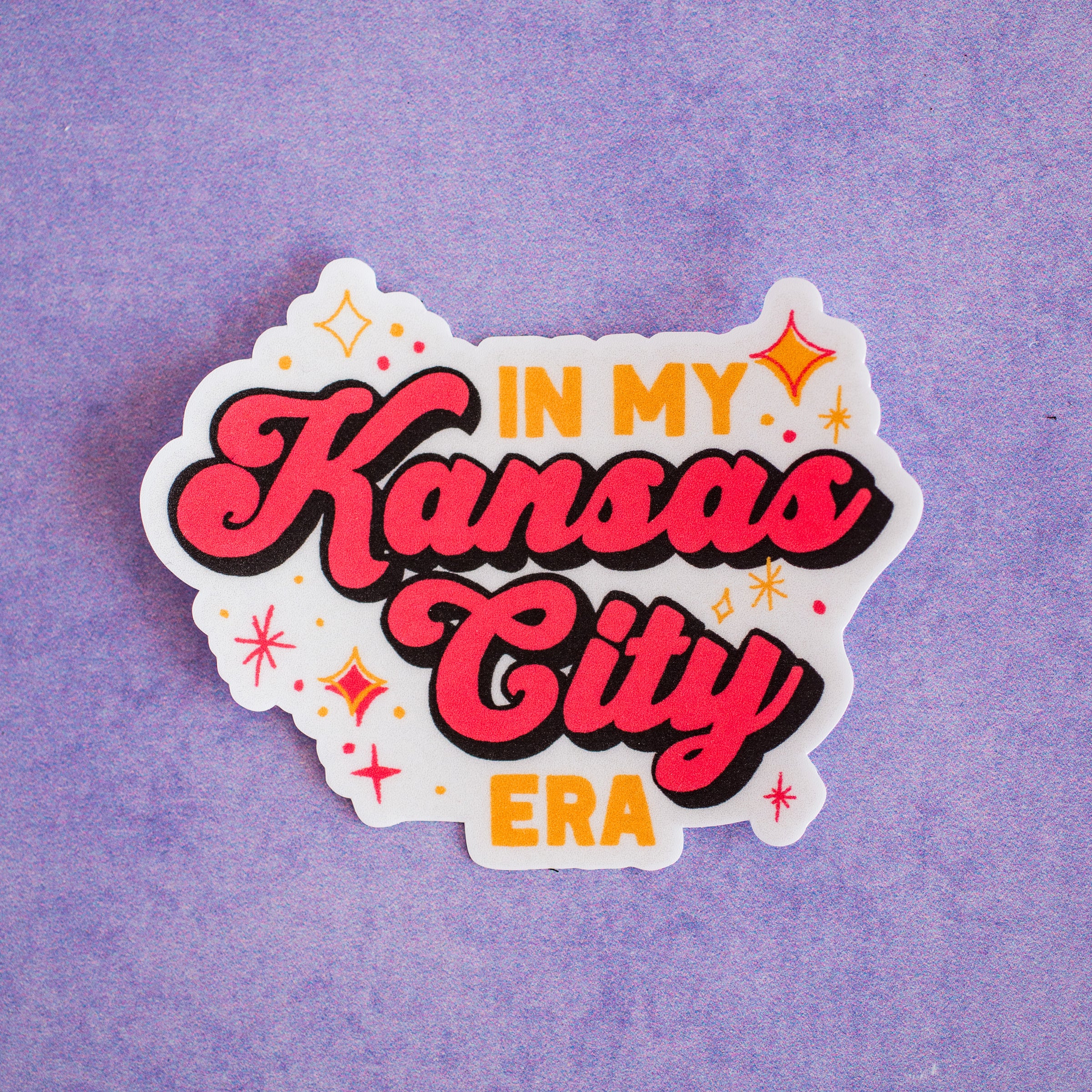In My Kansas City Era waterproof vinyl sticker. 3 inches by 2.25 inches. Waterproof, UV proof, scratch resistant, and super durable! Printed on high quality vinyl with a clear, matte laminate to seal the print.